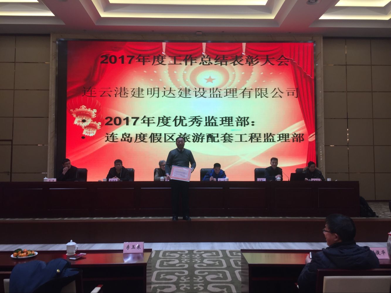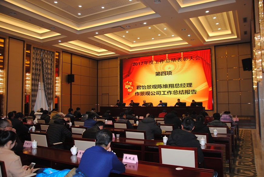 下午五點(diǎn),2017年工作總結(jié)表彰大會(huì)在溫泉大酒店會(huì)議中心準(zhǔn)時(shí)召開??偣径聲?huì)領(lǐng)導(dǎo)李清洋、王家松、徐遠(yuǎn)航,君怡景觀公司總經(jīng)理,建明達(dá)監(jiān)理公司總經(jīng)理劉新吉,建明達(dá)監(jiān)理公司總工姚加千,各職能部門經(jīng)理、各項(xiàng)目總監(jiān)及全體員工參加了大會(huì)。
