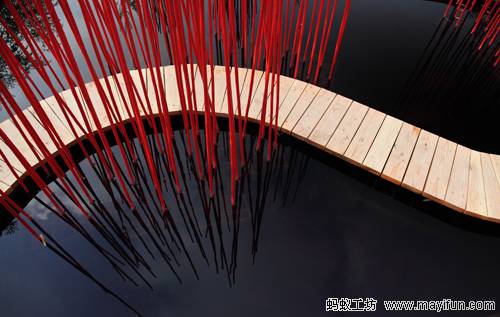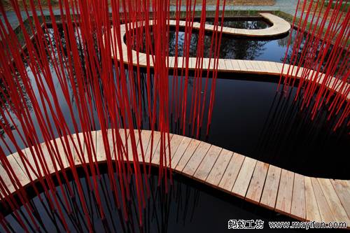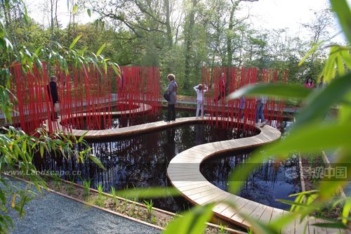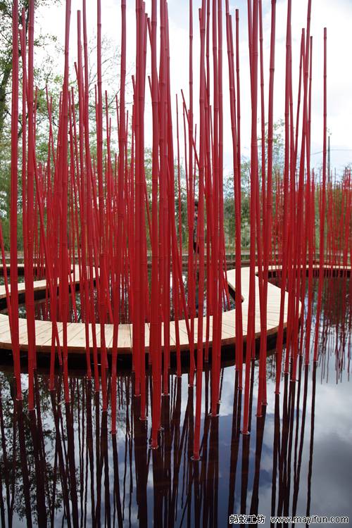 曲線形的木棧道對角穿越方形水池,漂浮于水面。小棧道僅50厘米寬,容一人穿行。它是“圓”的符號,也是體驗(yàn)水池?zé)o限風(fēng)光的路徑。水池中間是三叢紅色竹竿,它們可取之四周竹林的老桿,是可再生的材料。垂直的竹竿叢沿木棧道分布,令行走在棧道上的游客體驗(yàn)穿越的快感。垂直的竹叢倒影水中,與變換的天景相輝映,創(chuàng)造出寧靜和深遠(yuǎn)的氛圍。雖然水深只有30厘米,卻通過垂直向天的紅色竹竿,創(chuàng)造出無限深遠(yuǎn)的感覺。方圓周邊和水中植物全部為中國植物,渲染出濃郁的中國氣氛。